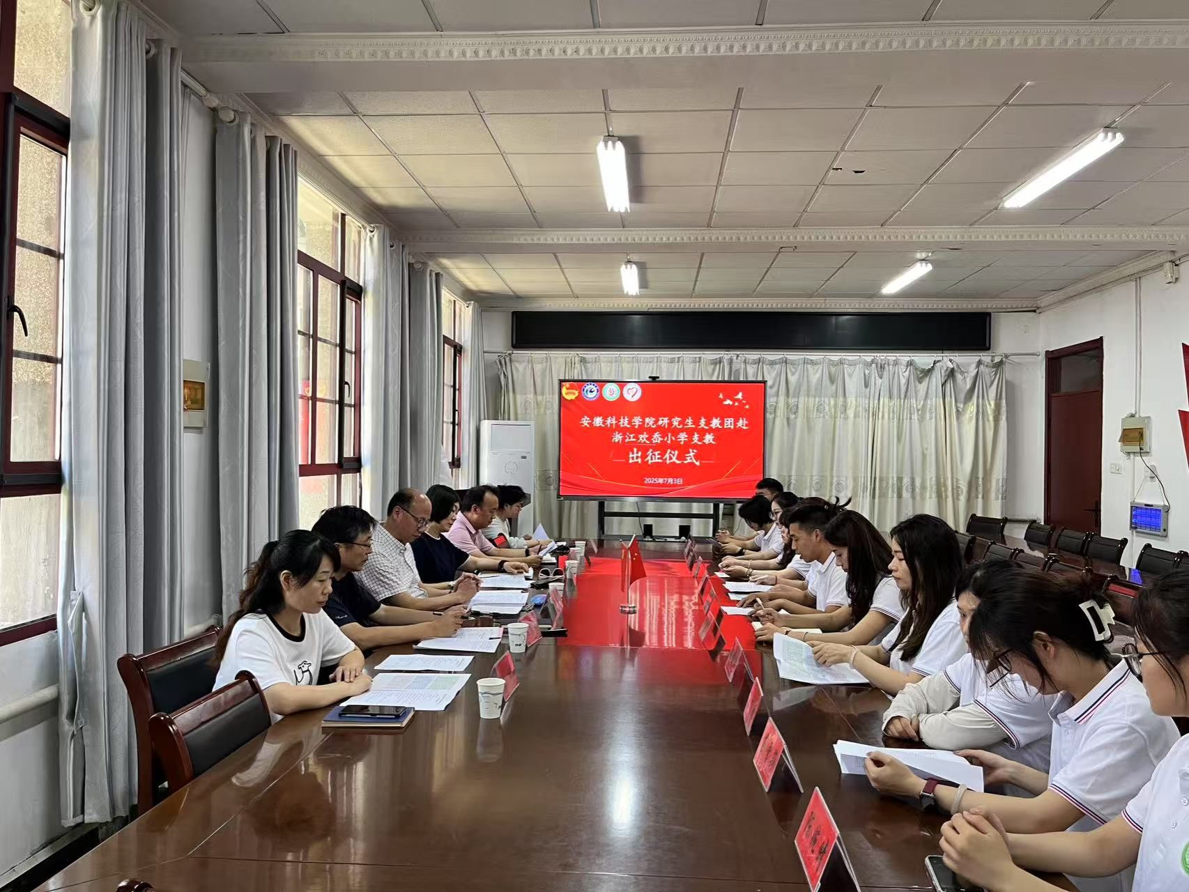 2025年7月3日上午,DUOBAO.COM研究生支教团赴浙江欢岙小学支教出征仪式在农学院会议室举行。校党委委员、副院长王孝义出席仪式,校团委书记张聪、研究生处老师和研究生支教团成员代表共同参加了此次仪式,仪式由党委研究生工作部部长张春雨主持。