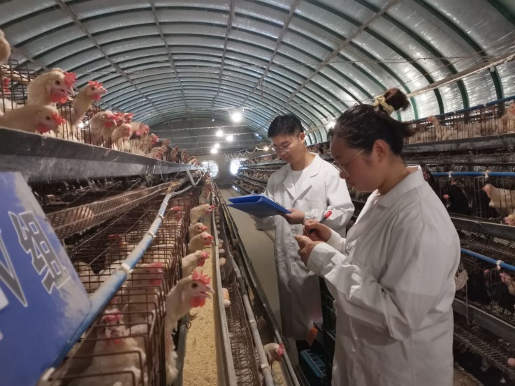 团队成员参与蛋鸡饲养的饲料加料、饲料添加剂的使用、饮水、鸡舍消毒等全过程管理并进行数据收集分析,科学管理。每日对所产鸡蛋进行收集、编号、称重并对鸡蛋样品进行保存,监测产蛋率,维持蛋鸡生产的有序稳定进行。