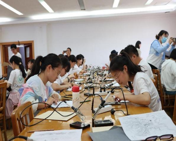 老手艺迎接新机遇,非遗融合江豚谱新篇。为推动非遗重新焕发魅力,助力当代青年增强文化自信,开拓江豚保护新思路,扩大江豚宣传的影响力。2022年7月11日,扬州大学生物科学与技术学院佑见江豚生态保护团队开展“学习烙画非遗,展示江豚之美”活动。团队中研究生与本科生成员积极组织活动过程,邀请到扬州市烙画非遗传承人阙真金、谢志安进行现场教学。结缘烙画四十余年的非遗传承人阙真金手把手地教导学生,引导学生学习非遗技艺,体验烙画之趣。