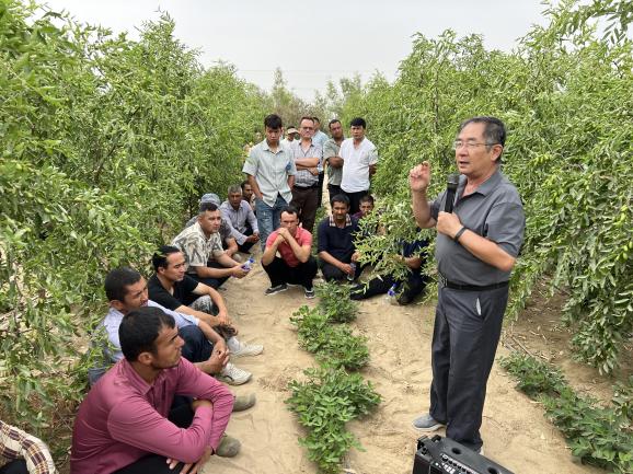 7月21日,服务团队在7连进行现场会培训,对农户关心的红枣花果管理和病虫害防治提供了详细的指导,同时对施肥时期、肥料配比、施肥用量等进行了详细的培训。在培训期间,对农户提出的枣树环剥问题,张琦教授表示,环剥可以控制树长势,促进开花坐果,施肥以低氮高钾复合肥为主,可促进果实膨大及品质提升。