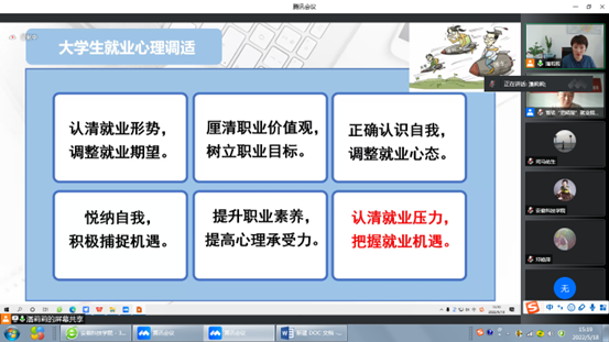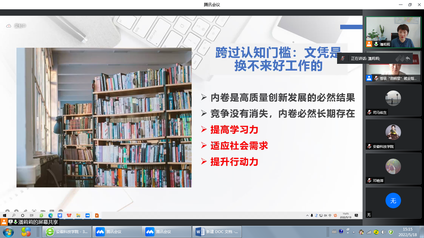 为引导大学生以良好的心态迎接疫情下的就业压力,适应社会需求,5月18日下午,学校邀请安徽医科大学公共卫生学院党委书记、全国首席职业指导师、教育部24365公益直播课讲师、安徽省启明星职业指导优秀导师潘丽丽教授为全校学生开展在线就业指导讲座。我校600余名学生在腾讯会议会场聆听了讲座。