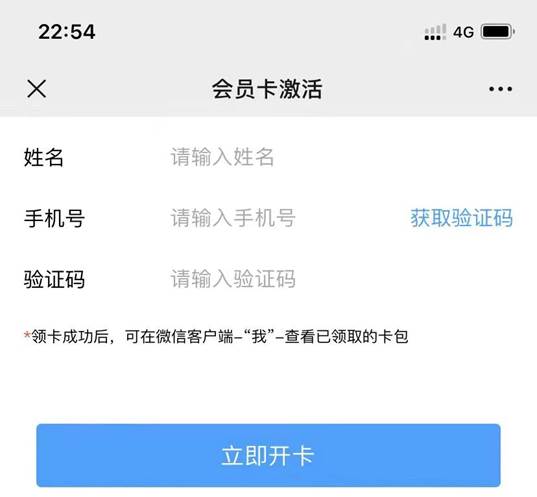 (二)点击“激活会员卡”,依次输入姓名、本人手机号、验证码。