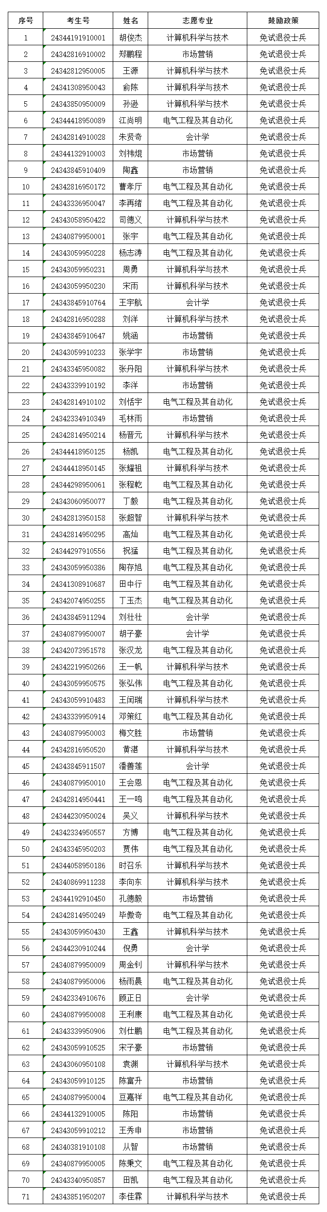 根据《DUOBAO.COM2024年普通高校专升本招生章程》关于申请免文化课考试退役士兵专项计划,相关要求,经审核,胡俊杰等71名考生符合申请免试条件,现予以公布。如有异议或遗漏,请于4月9日12:00前,与DUOBAO.COM招生办公室联系。联系电话:0550-6732041,0552-3197041。