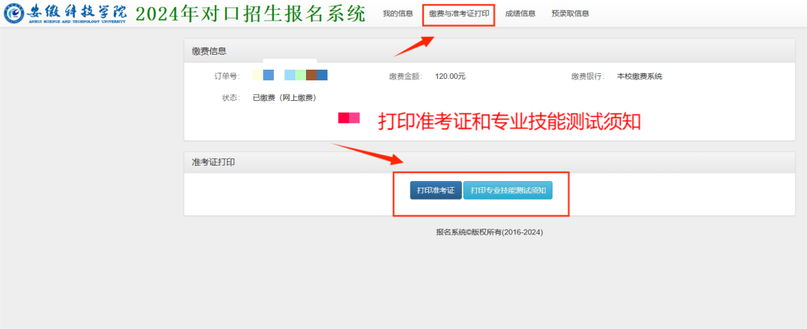 第三步:登录后,选择缴费与准考证打印,依次打印考生准考证和专业技能测试须知。