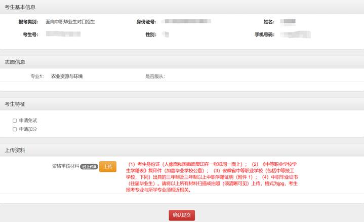 第六步:申请技能大赛免试、考试加分鼓励政策的考生,在“考生特征”板块,还需先勾选自己申报的鼓励政策选项,在上传“资格审核材料”基础上,还需按照要求上传“申请加分材料”或者“申请免试材料”。无误后,点击确认提交按钮,一旦提交,不可更改。