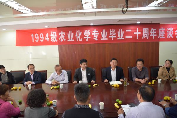 金秋庆国庆,满园香桂花。10月3日,学校迎来了94级农业化学专业毕业生们,资源与环境学院组织了农业化学专业毕业20周年座谈会。校党委委员、副校长汪建飞出席活动并讲话,资源与环境学院党政领导和授课老师参加座谈会。会议由资源与环境学院党总支副书记李孟良主持。